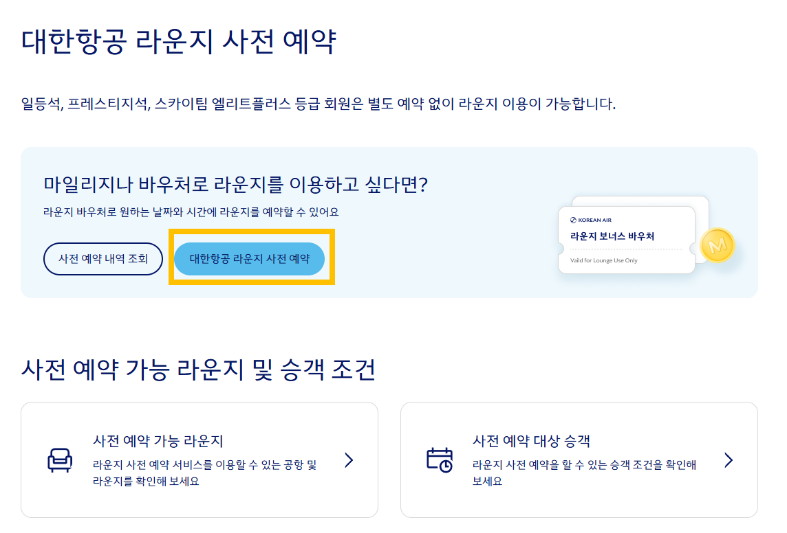 프레스티지석을 이용하지 않는 경우에는 라운지를 미리 예약하라고 되어 있다.