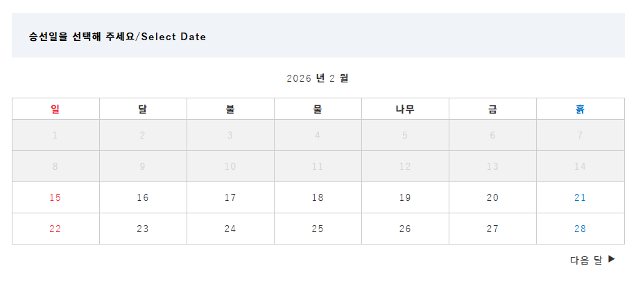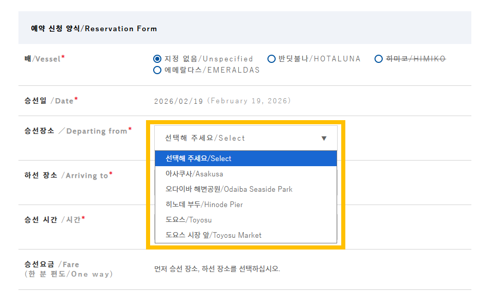 날짜 선택 이후에는 승선 장소를 선택한다.