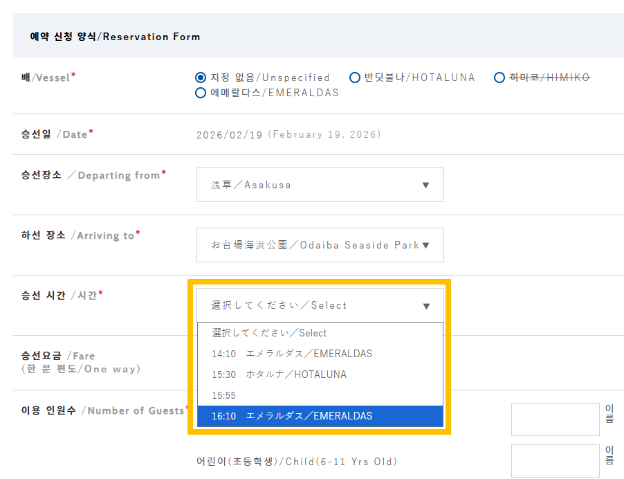 승선 시간 역시 선택을 하는데 배도 나와 있다.