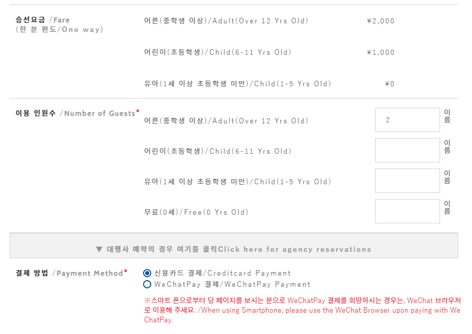 그냥 앞쪽의 일반 좌석을 이용한다고 생각하고 2명해서 4,000엔을 결제했다